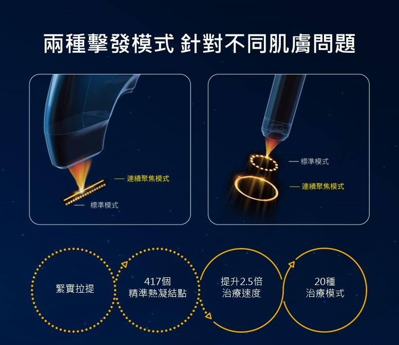 • 10個治療探頭都具備標準模式與連續聚焦模式,醫師可在治療時評估個人老化問題進行模式切換,客製出最符合消費者預期效果的專屬療程。