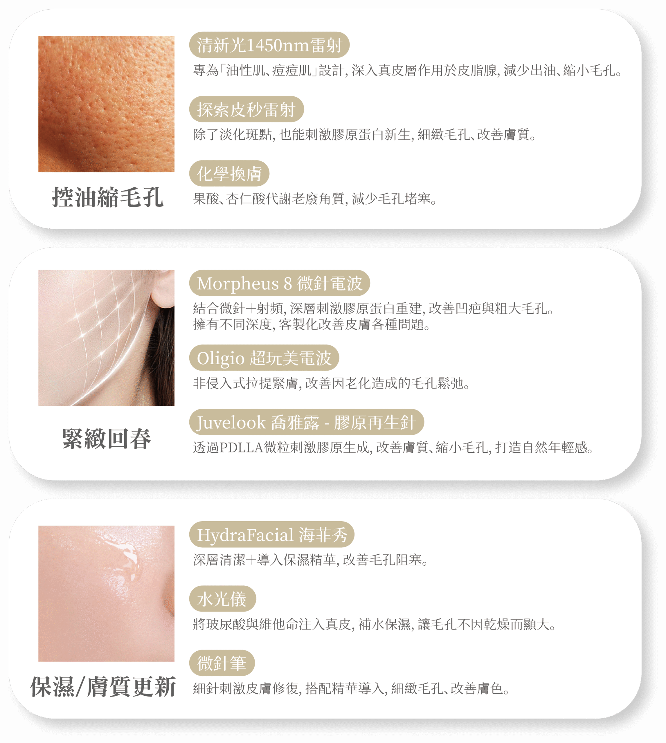 - 年輕族群:以「控油」為主,推薦 清新光1450nm、化學換膚、海菲秀,再搭配 水光槍或微針筆 加強保濕。