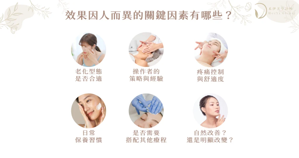 - 鬆弛較明顯、或生活作息很操(熬夜、壓力、常曬):可能需要更積極的維持規劃,或搭配其他療程把短板補起來。